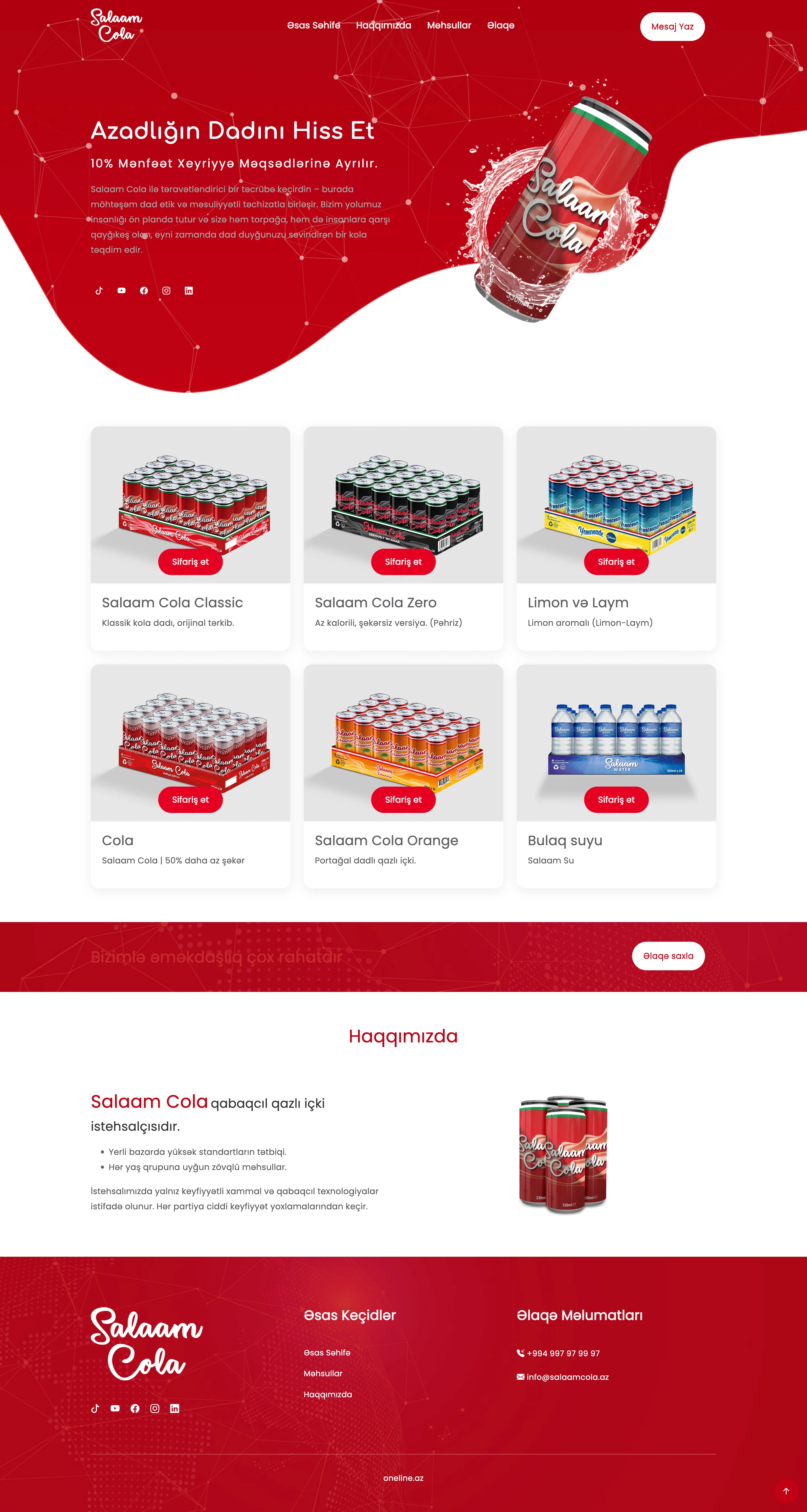 Salaam Cola qabaqcıl qazlı içki istehsalçısıdır. Yerli bazarda yüksək standartların tətbiqi. Hər yaş qrupuna uyğun zövqlü məhsullar. İstehsalımızda yalnız keyfiyyətli xammal və qabaqcıl texnologiyalar istifadə olunur. Hər partiya ciddi keyfiyyət yoxlamalarından keçir.